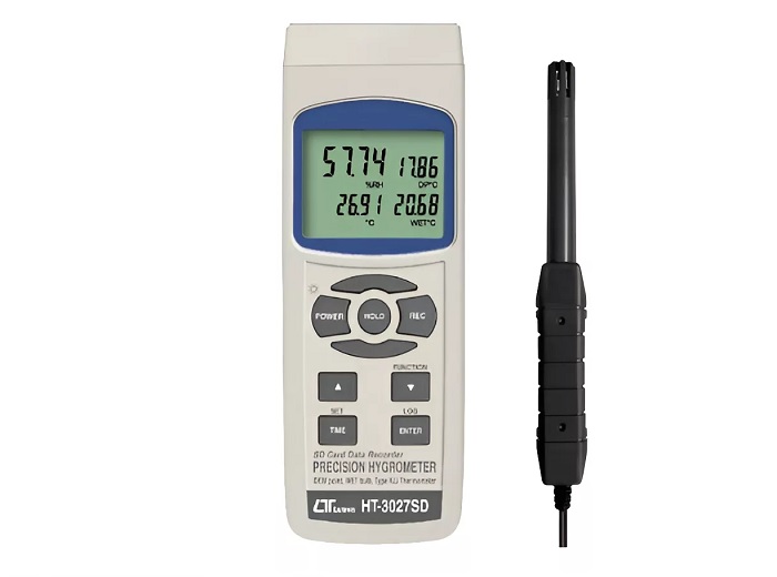 Medidor digital de humedad, temperatura ambiental, punto de rocío, temperatura de bulbo húmedo y conexión para termocuplas K/J, marca LUTRON, modelo HT-3027SD, con datalogger interno para mediciones. Incluye Certificado de Calibración de Fábrica y Manual en inglés.